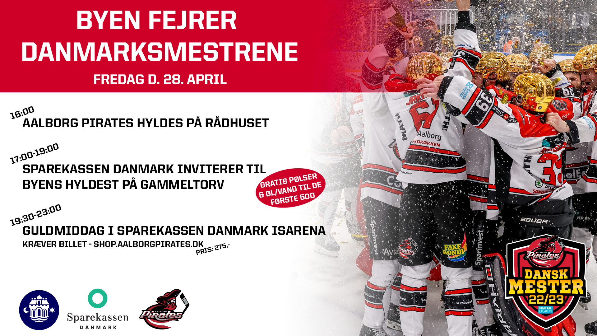 Guldmiddagen kræver billet og koster 275,- Læs mere og køb billet her: https://shop.aalborgpirates.dk/arrangementer/guldmiddag23
